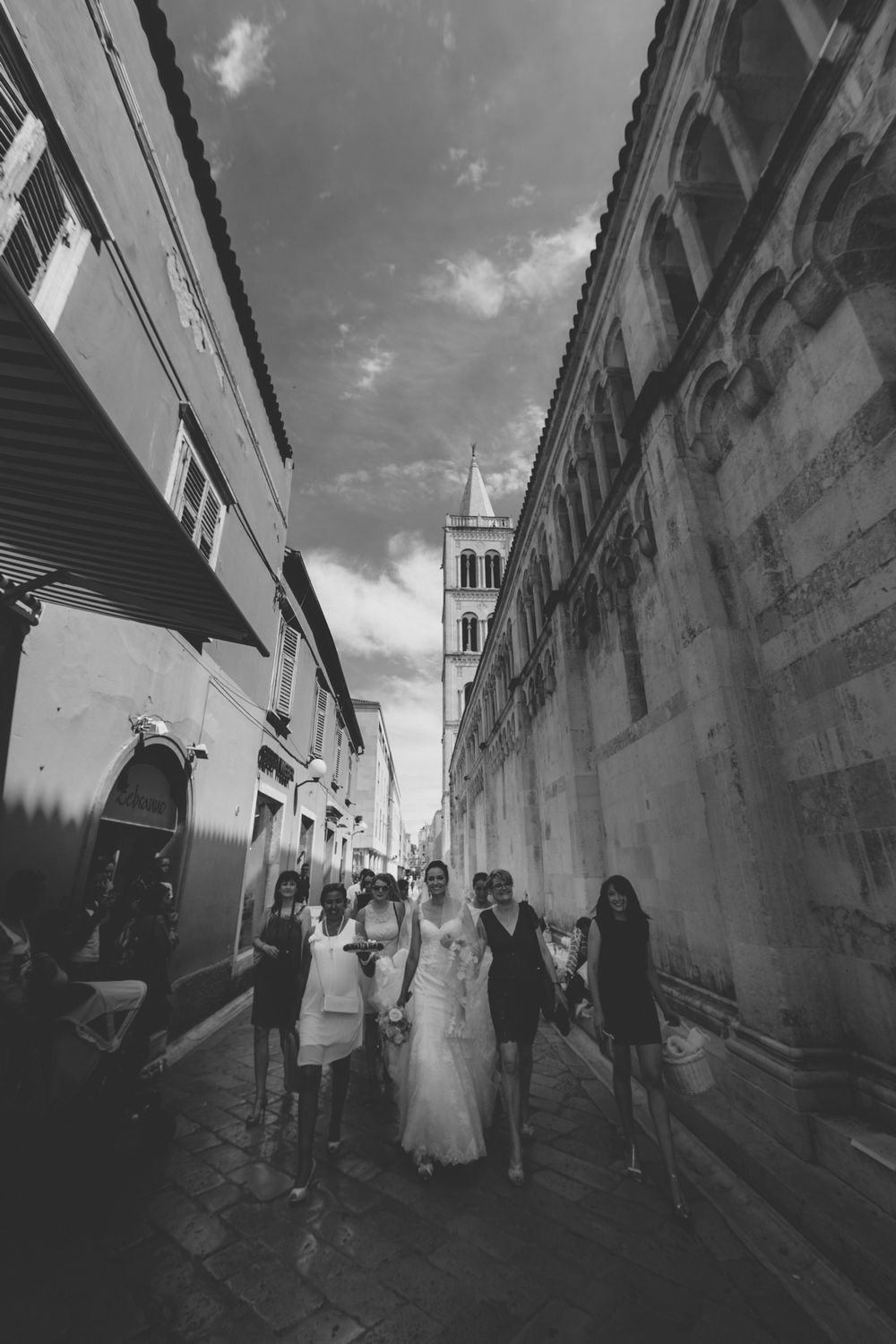 Ne tako davno Srđanov prijatelj je rekao : “Srđane, ne okreći se, zaljubit će se”, ali okrenuo se i bila je to ljubav na prvi pogled, tako je počela njihova ljubavna priča. Paris, grad ljubavi, ih je spojio ali za svoje sudbonosno da su izabrali romantični Zadar. Zadar je grad star 3 000 godina, te sa svojim malim i slikovitim uličicama skriva mnoge ljubavne priče i kao takav je savršeno mjesto za vjenčanje uz more. Iako žive u Parizu, njihovi korijeni i opijenost ljepotom Hrvatske bili su presudni u odluci o mjestu vjenčanja. Ceremonija vjenčanja održala se u katedrali Sv. Stošije, najveće Crkve u Dalmaciji. Kroz spajanje francuskih i hrvatskih običaja ovo vjenčanje je dobilo posebnu draž. Atmosfera je bila spoj romantike i sreće, nadamo se da će slike svjedočiti i biti podsjetnik Srđanu, Jeleni i njihovoj djeci na predivnom vjenčanju na otvorenom održanom u Zadru.