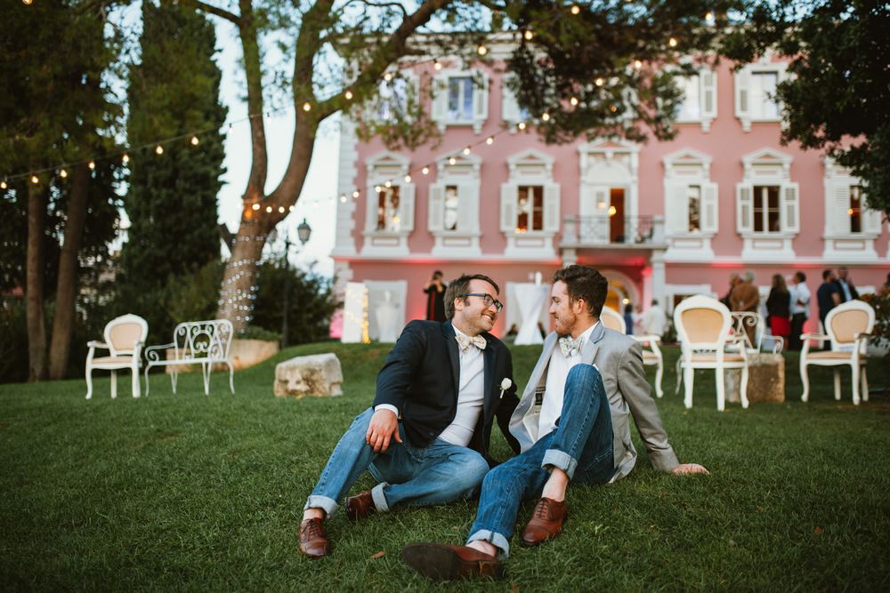U vrtu Ville Polesini najčešće je postavljena vjenčana sjenica kao kulisa za obred vjenčanja. Ona je vrlo zgodna instalacija jer se u slučaju kiše može prenijeti i u unutarnji prostor kao što je bilo na vjenčanju Matta i Harpera (pogledajte ovdje). Što se tiče uređenja za svadbenu večeru tu su mogućnosti bezbrojne, te sve ovisi o željama i ukusu mladenaca. Matt i Harper za večeru su izabrali crne stolnjake kao kontrast nježnom, svijetlom cvijeću, čime je prostor večere dobio svečanu, ozbiljniju notu, a koja je kontrast njihovoj nježnoj, mirisnoj sjenici od svijetlog cvijeća i bijelog tila.